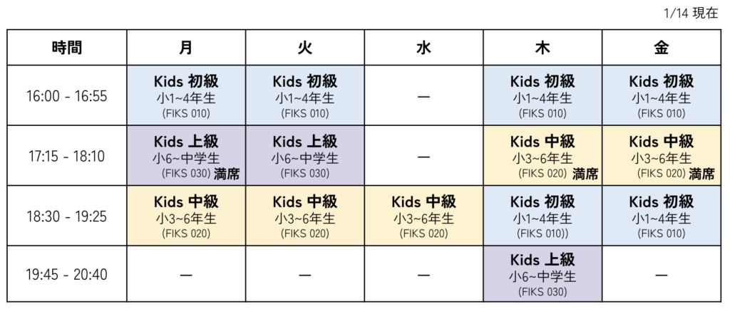 1) 火曜17:15クラスはKids初級クラスから上級クラスに変更とさせていただきます。現在こちらのクラスにご在籍の方には別途ご連絡を差し上げておりますのでご確認をお願いいたします。変更でご迷惑をおかけしますことをお詫び申し上げます。